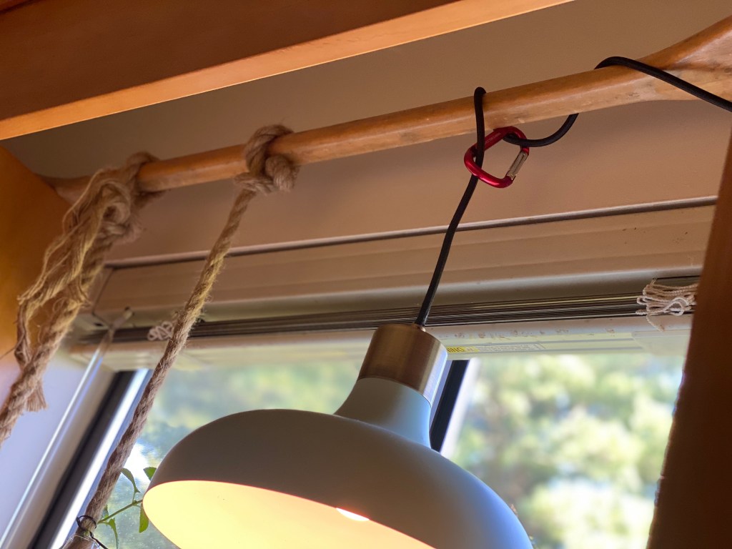 Because the theme of the space is now “easy and already owned”, I hung the globes by just knotting the ropes, and the pendant light with a simple carabiner.