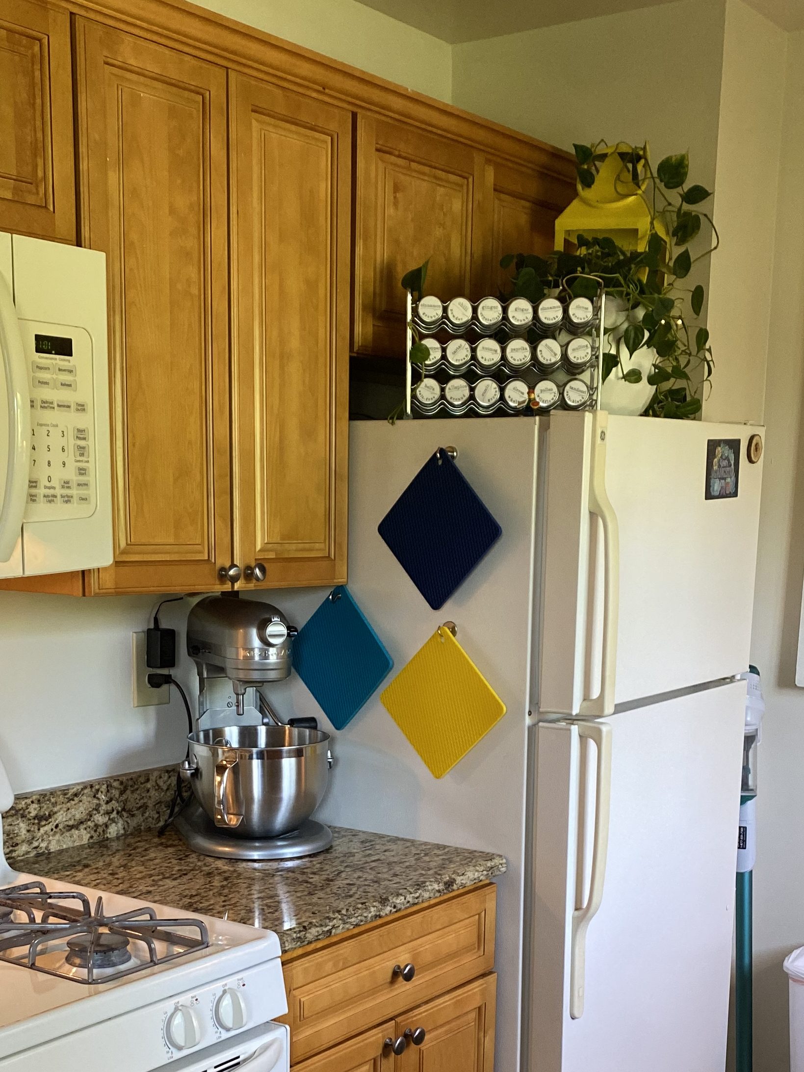 Spices are typically happier in cool, dark places, but I finally got a spice rack I LOVE last year, and it would take up an entire shelf in my cabinet, so I’m keeping it out on the fridge. Spices I use less frequently I still hide away, these are the ones I tend to use more often.